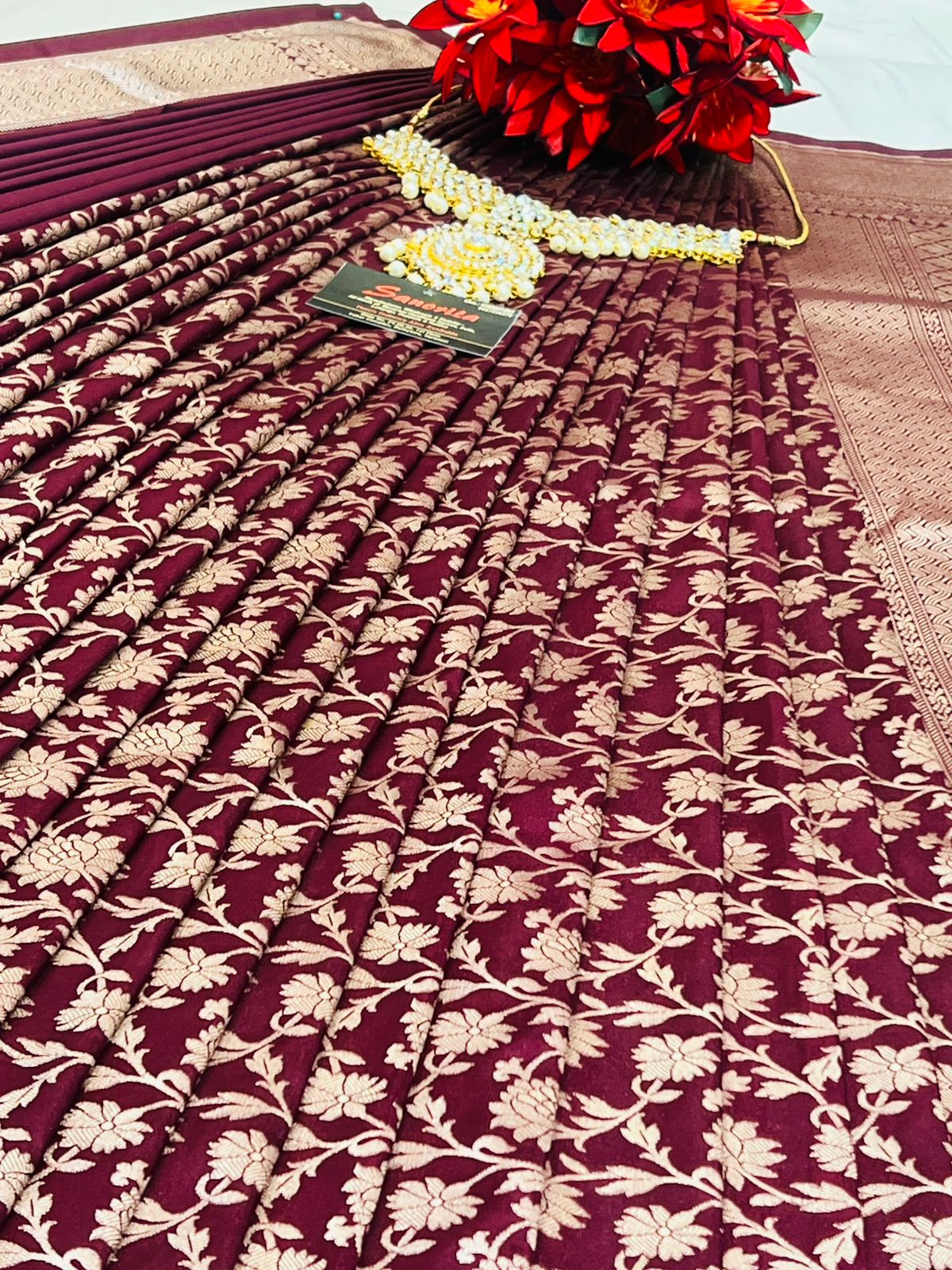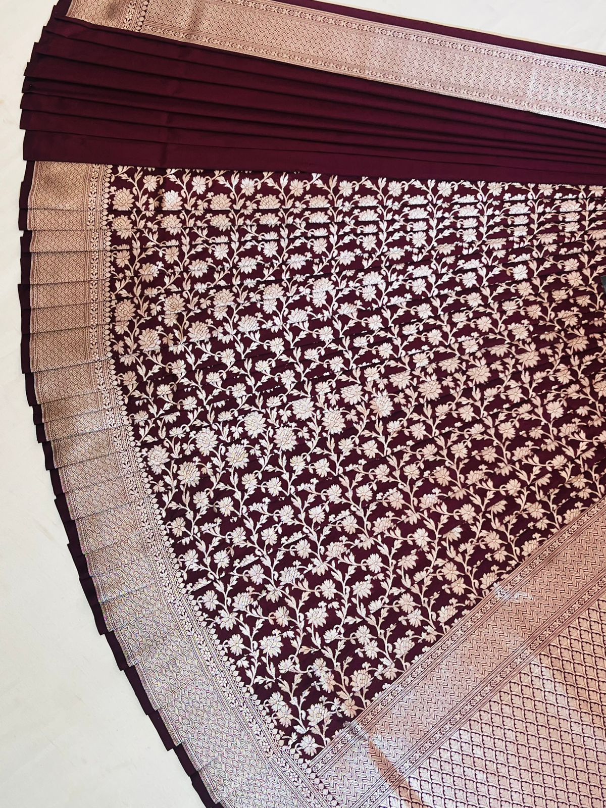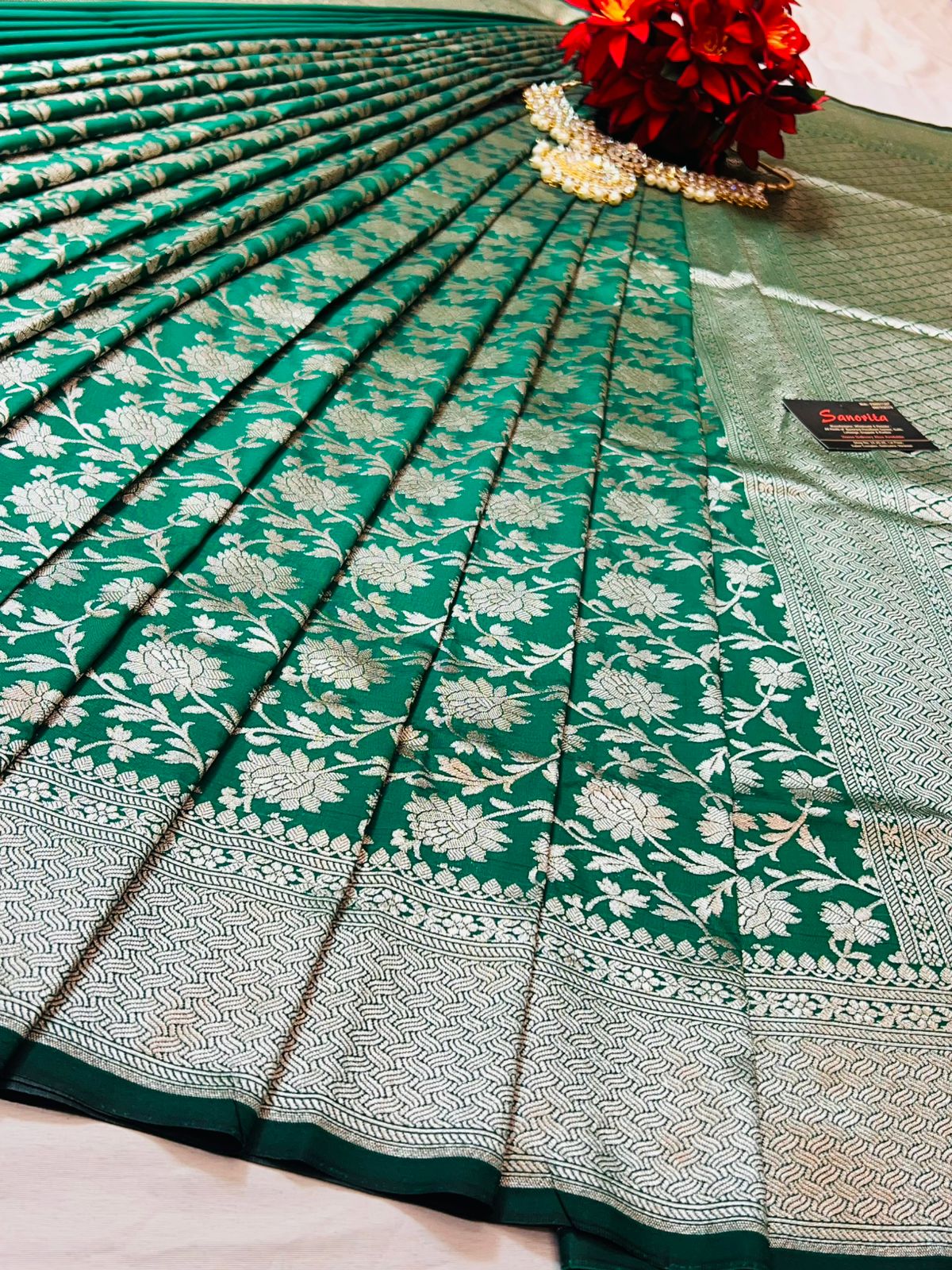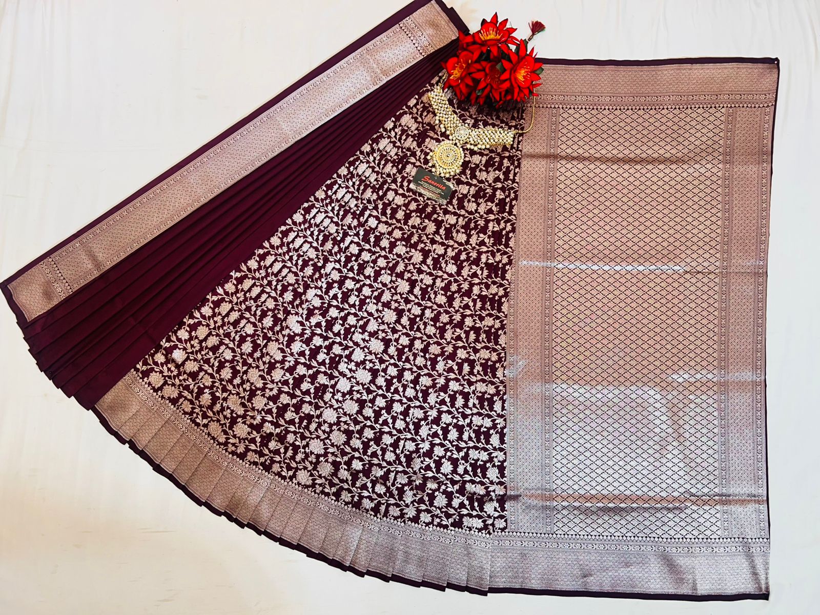 Known for their smooth drape and lustrous finish, Semi Katan Jaal Sarees bring the grandeur of Banaras weaving heritage while being easier to carry than pure katan silk. They are ideal for weddings, parties, and traditional celebrations where grace meets comfort.