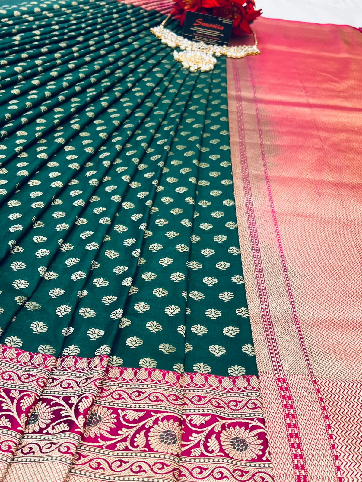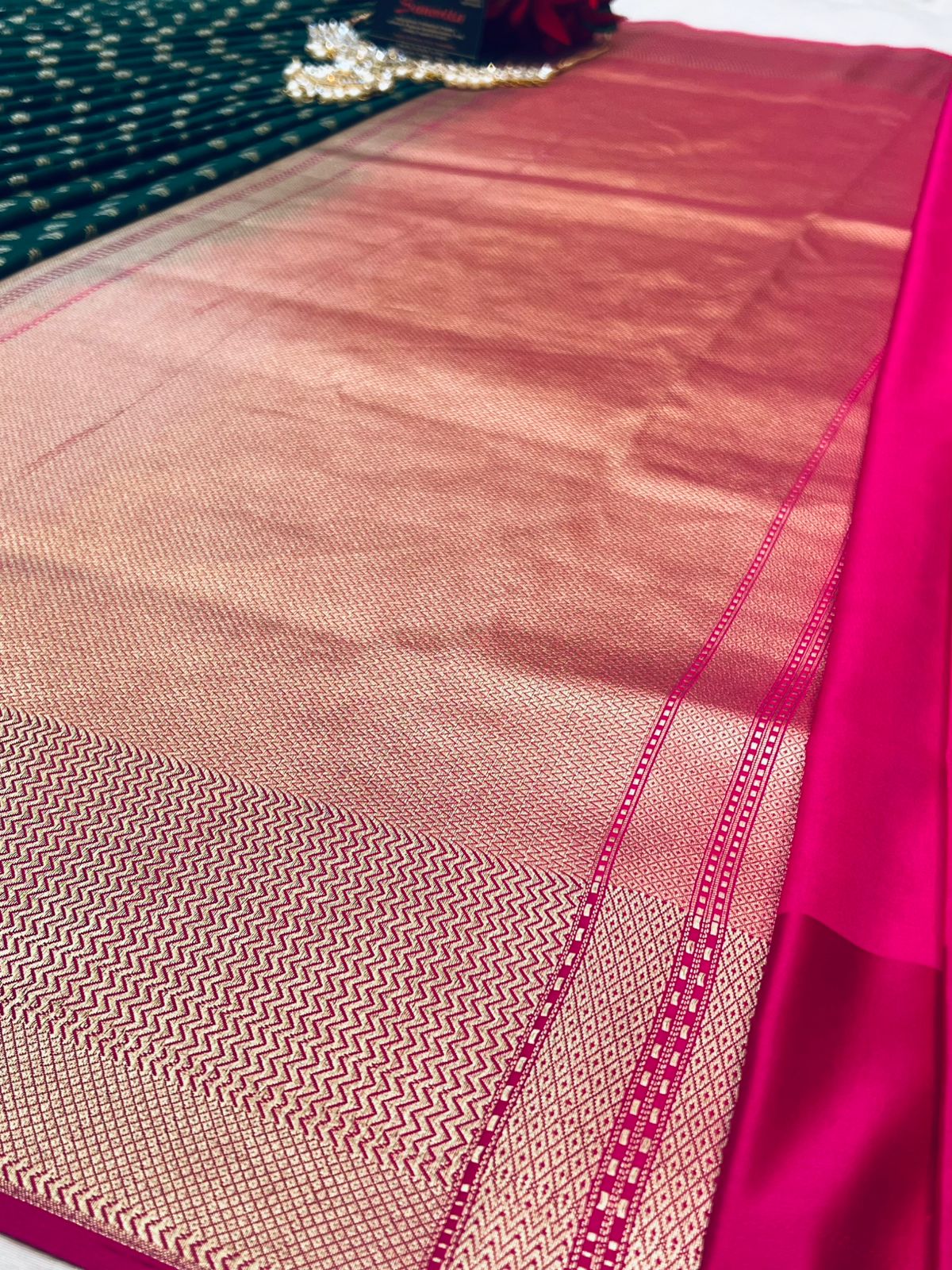 Banarasi Semi Katan Silk Sarees are a blend of traditional elegance and modern comfort. Made with fine semi-katan silk threads, these sarees showcase the luxurious charm of pure Banarasi weaving while being lighter and easier to drape. Known for their soft texture and graceful fall, they are adorned with intricate zari work, meenakari motifs, floral patterns, and traditional Banarasi designs inspired by Mughal artistry.